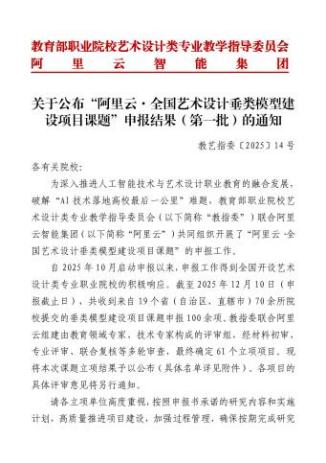 “阿里云·全国艺术设计垂类模型建设项目课题”是教育部职业院校艺术设计类专业教学指导委员会与阿里云智能集团为深入贯彻《国务院关于深入实施“人工智能+”行动的意见》精神,破解“AI技术落地高校最后一公里”难题而联合发起的重要项目。项目旨在通过校企深度合作,探索人工智能与艺术设计职业教育的融合路径,共建具有行业应用价值的垂类大模型,提升艺术设计人才培养质量与产业服务能力。自2025年10月启动申报以来,全国19个省(自治区、直辖市)70余所院校提交100余项申报课题,经教育领域专家、技术专家多轮材料初审、专业评审与联合复核,最终确定61个立项项目,我院申报课题凭借鲜明的地方特色与创新的教育理念成功入选。